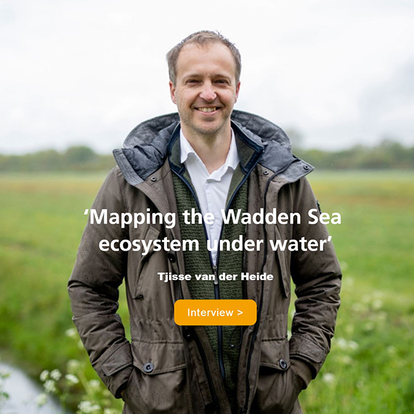 Tjisse van der Heide, professor of Coastal Ecology, studies ecological interactions along the entire elevational gradient of soft-sediment coasts: from coastal dunes, salt marshes and intertidal mudflat all the way down into the subtidal which never emerges during low tide. ‘These shallow coastal areas are important, because they protect our coasts, serve as drinking water sources, and support many different plant and animal species. In contrast to rocky shores, that are characterized by steep gradients from high to low, healthy soft-sediment coasts typically have long elevational gradients supporting a diverse mosaic of coastal habitats. However, as a consequence of coastal development on one side and sea level rise on the other, humans have restricted these long gradients into a progressively narrowing coastal strip – a process called the ‘coastal squeeze’. This is resulting in great loss of coastal habitat and the functions and services they provide’