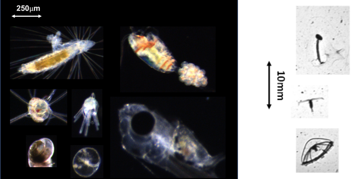 Left: Some images taken with the CPICS camera this cruise. On the images are (i) a copepod with eggs, (ii) sea sparkle (Noctiluca scintillans), and larva of a (iii) gastropod (snail) (iv) bristle worm (v) fish (vi) sea urchin (vii) sea star. Can you guess what is what?