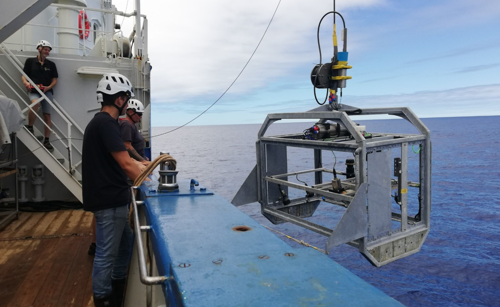 The Hopper tow-cam is an HD video platform specially designed to be operated on board of the RV Pelagia. It is lowered on starboard side of the ship and dropped down at a predefined station of interest to start a video transect, subsequent waypoints were selected and a heading was decided upon. It is called a tow-cam because it has no own propulsion but is towed behind the ship. For this, an excellent communication between bridge and tow-cam operators is established.