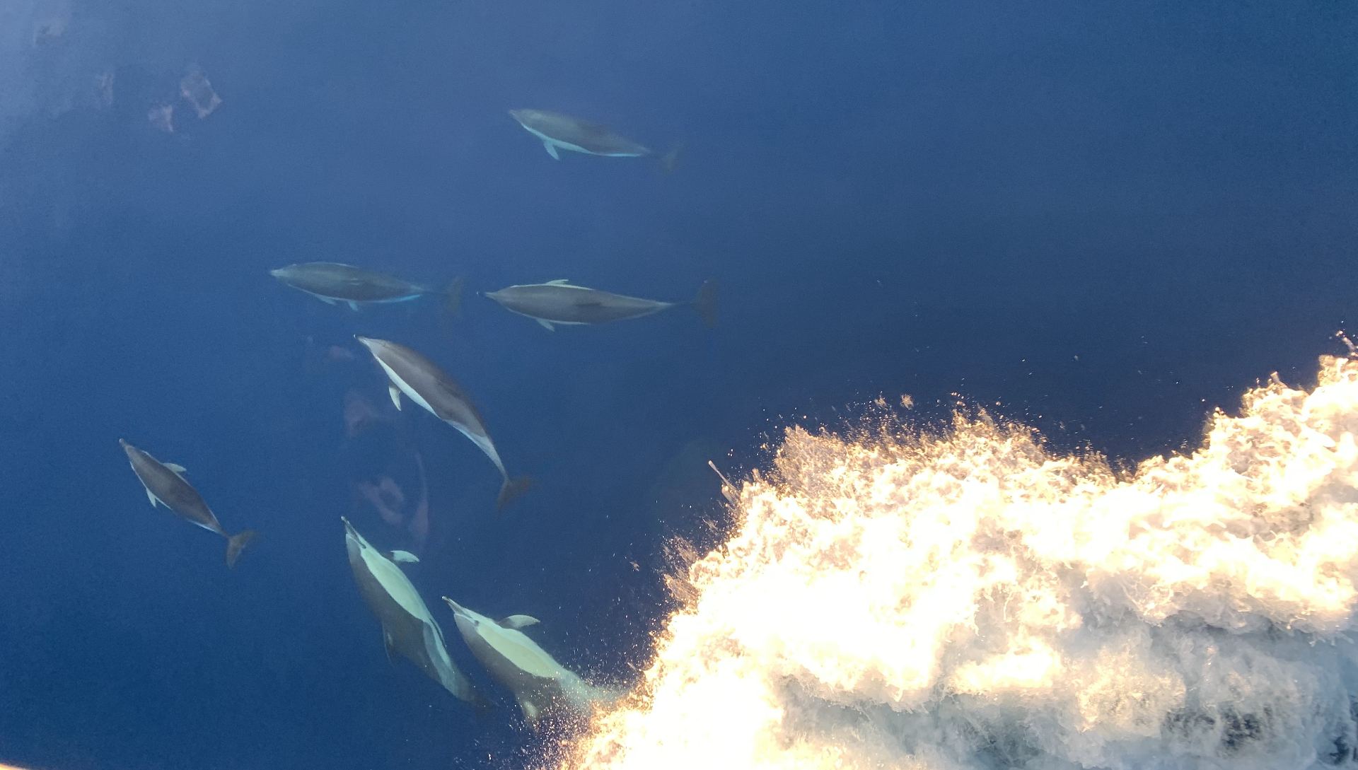 After dinner, we made the most of the calm, balmy conditions and sat back to watch for cetaceans in the vast expanse of ocean that lay before us. With the surface of Atlantic looking like a sheet of glass, we certainly had no difficulty spotting them! In the distance we could see dolphins jumping in and out of the water, and in no time, we had a group swimming alongside us- a school of Atlantic spotted dolphins (Stenella frontalis). Another 20 minutes passed and we had another, much larger group of dolphins swimming beside the ship- this time Common Dolphins (Delphinus delphis). And finally, we had an amazing encounter with three short-finned pilot whales (Globicephala macrorhynchus), who were much less energetic and sensibly avoided coming too close to the ship!