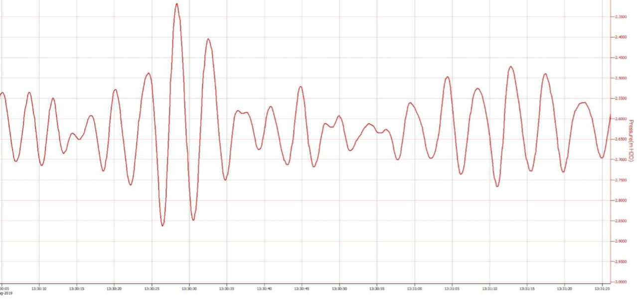A short sample reveals the the wave climate of the shallower site in Piscadera Bay. Wave sets (4 waves of more) are visible as well as the effect of backwash in between sets. The latter shows up as asymmetric wave crest and indicates the reflection incident waves against the coast.