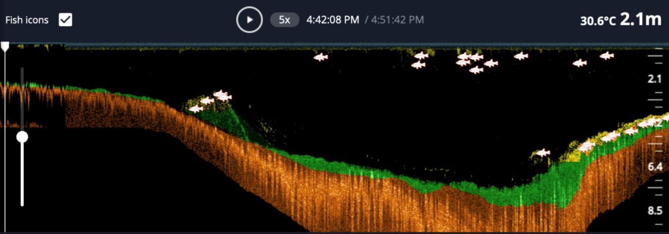 The deeper sensor is connected via wifi to a smartphone and delivers in real time 2D images of the bottom profile. The acoustic waves can penetrate the bottom and allow for the imaging of the stratigraphic structures. Also, the sonar can detect fish and other animals moving.