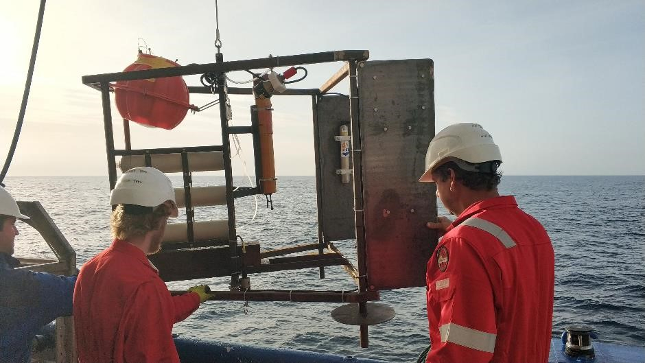 Ultra Clean Near Bottom Sampler prototype is deployed for the first time on the Pelagia. The grey tubes are the actual sample collection devices and the orange sphere contains the camera. (In this photo by Bob Koster from left to right, Jan-Dirk de Visser, Stephan Haanstra and Peter van Maurik).