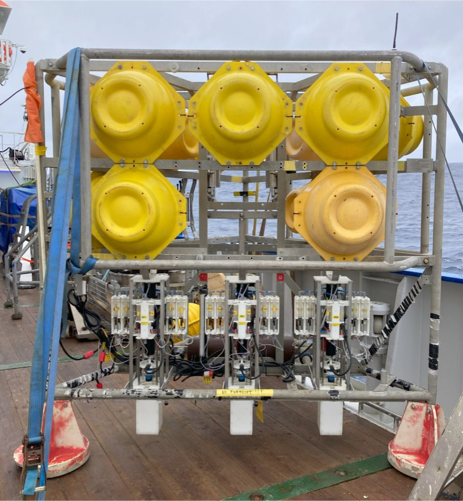 Before launching the lander, there is a significant amount of preparation to program the instrument and associated sensors to measure temperature, oxygen, currents, and other things of interest. 30 syringes are prepared and attached to tubing to sample water at the seafloor. Despite our preparations and meticulous completion of the pre-launch checklist, I must admit to some trepidation when I saw the lifting cable released and the lander sinking slowly out of sight! The yellow “hard hats” contain glass spheres to provide floatation, and once on the seafloor, the 3 white rectangular experimental chambers are pushed by hydraulic cylinders into the sediment. Then, the top of the chamber is sealed for the duration of the experiment. The program inside the instrument instructs the various syringes to inject things into the chamber or take a sample from the chamber or surrounding seawater. In that way, we can measure the rate of biological and chemical processes on the seafloor, under natural conditions.