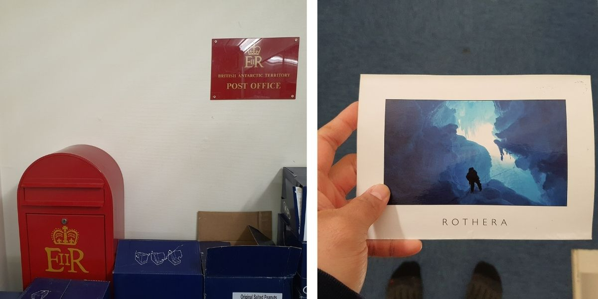 (L) The British Antarctic Territory post office; (R) sending off a postcard from Rothera, picturing a field trainee hiking down a crevice near the Rothera Research Station.