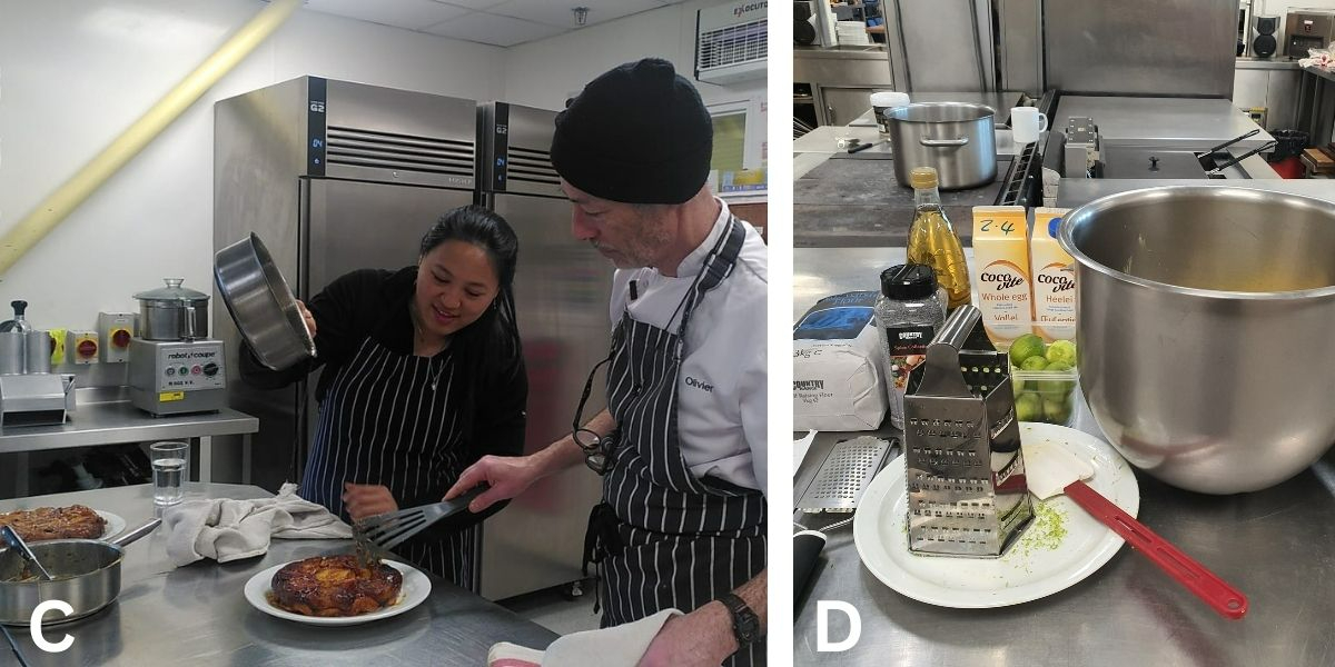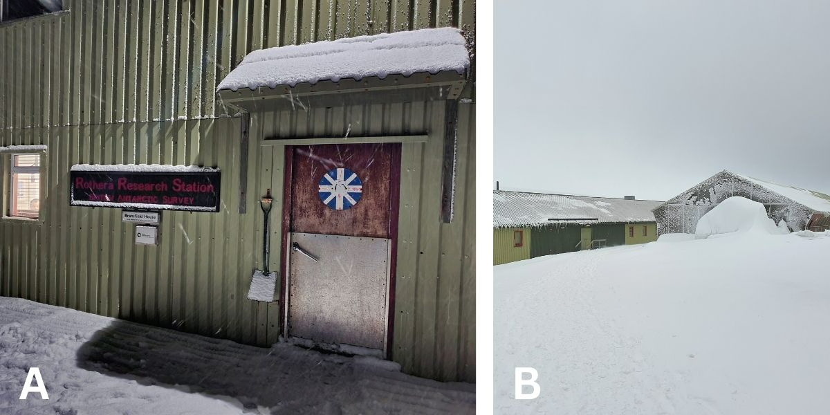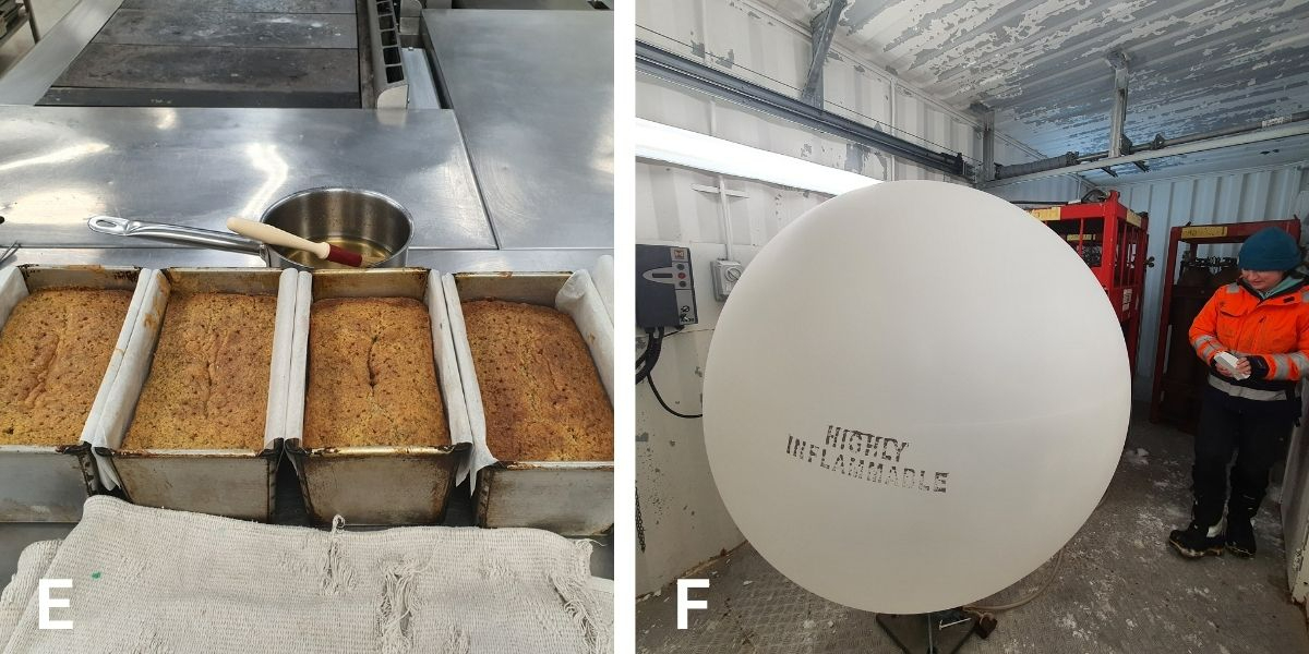 (A) The Bransfield house in the midst of a snowstorm (B) Snow piling up and blocking thoroughfare and entrances after many snowy days (C) postdoc Swan helping resident chef Olivier Hubert (BAS) prepare after dinner dessert for the station; (D) mise en place before baking up some (E) pound cake for the overwintering team to bring on their field training trips (F) Helping Jo Cole from the BAS meteorological team set up and launch the weather balloon of the day. Photos: Swan Sow