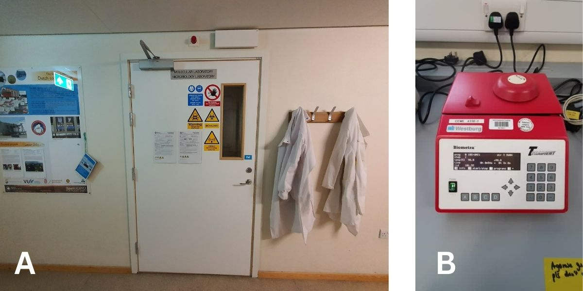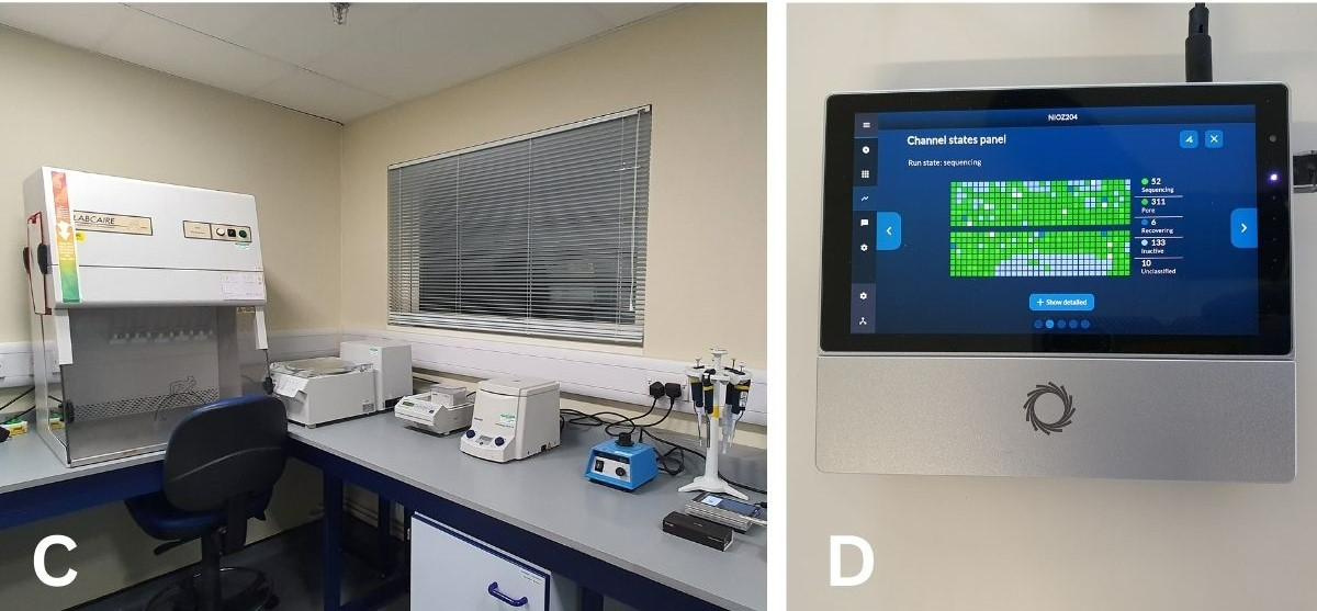 (A) The Bonner molecular and microbiology laboratory; (B) an ongoing PCR run to amplify microbial marker gene DNA in preparation for sequencing; (C) lab bench with our DNA sequencer setup; (D) an ongoing sequencing run. Photos: Swan Sow