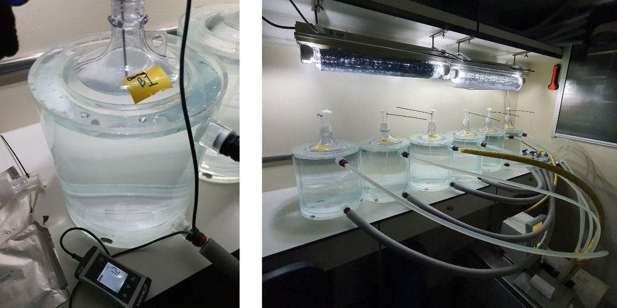 (L) Daily measurement of sample temperature (R) microcosm incubation setup. Photos: Swan Sow