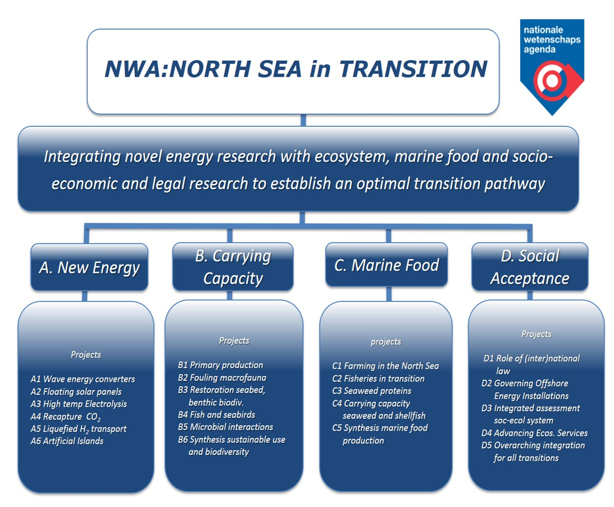 The coming decennia will mark a dramatic change in our North Sea, constituting more than 60% of the territory of The Netherlands. Driven by the need for an energy and food transition and bound by pressures from fisheries, shipping, oil, gas and sand extraction and marine protection, a balance between technology, economy and ecology in a complex system must be struck. Billions of Euros are going to be invested presenting a unique opportunity to create and exploit a healthy North Sea ecosystem by combining the major transitions: energy, food and nature. In this project we aim to integrate novel energy research with ecosystem, marine food and social research in a changing natural environment to establish an optimal transition pathway.