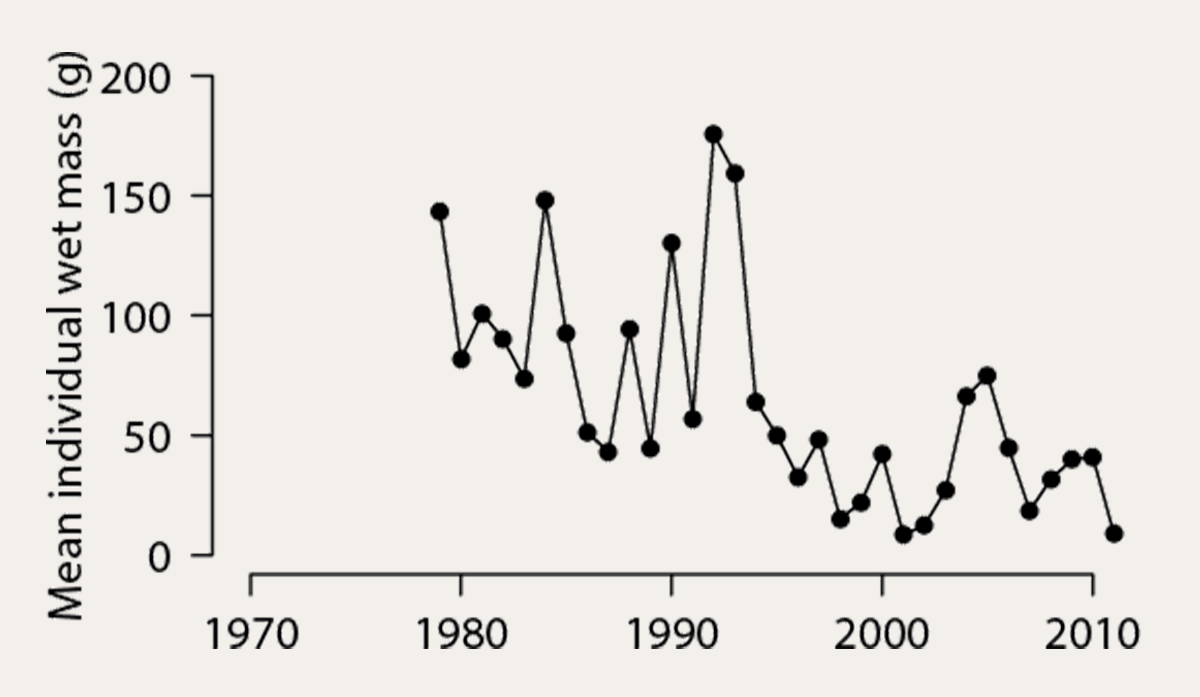 In 2015, an extensive analysis of the kom-fyke catches was published for the period 1960 - 2012. The main result was a negative trend in the daily catches from 1980 to the present, with a 10-fold decrease in total catch. The average fish mass decreased from about 150 to 20 g wet weight. These changes are most likely the result of the cumulative impact of a combination of factors, such as increased water temperature, habitat destruction in the coastal zone (sand dredging and beach nourishment, fishing), increased predation by top predators, and changes in large-scale hydrodynamic circulation.