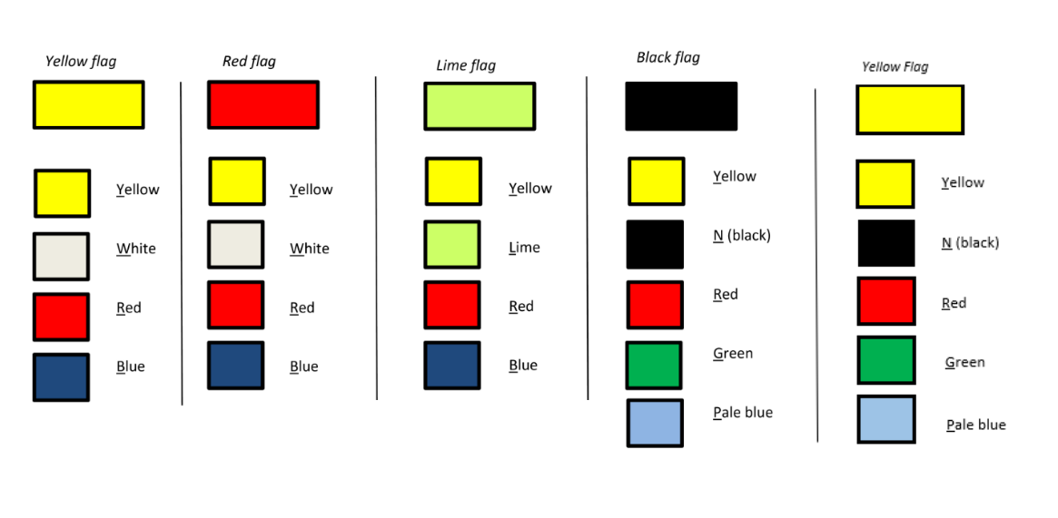 Since 2014, black flags are used in combination with four colour-rings