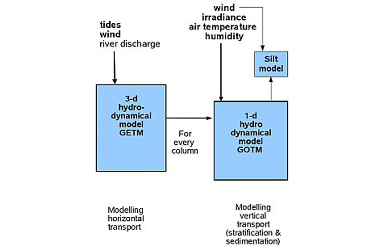The GETM model is a full 3D hydrodynamical model which uses the General Ocean Turbulence Model (GOTM) for the vertical turbulence structure. Spherical coordinates (expressed in latitude and longitude) are used in the horizontal plane, while sigma coordinates are used in the vertical (equidistant in shallow water and contracted near the surface and the sea bed in deeper water). The hydrostatic equations are solved on an Arakawa C grid in the horizontal using a mode splitting technique. Sea surface elevation at the boundary is derived from Topex Poseidon satellite altimetry data, and the model allows for the drying and flooding of tidal flats. For further detail cf. Burchard and Bolding (2002) and Stips et al. (2004).