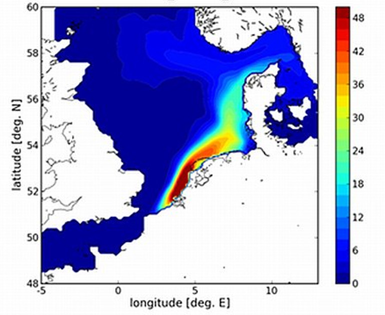 With the figures the distribution of nutrients originating from the rivers in the UK can be compared with the Dutch rivers Rhine and Meuse. It shows that the nutrients from theUK rivers do not reach the continental coast up to the tip of Denmark. The nutrients from the Dutch rivers stay close to the Dutch coast. At the tip of Denmark still 10% of the total N originates from the Dutch rivers.