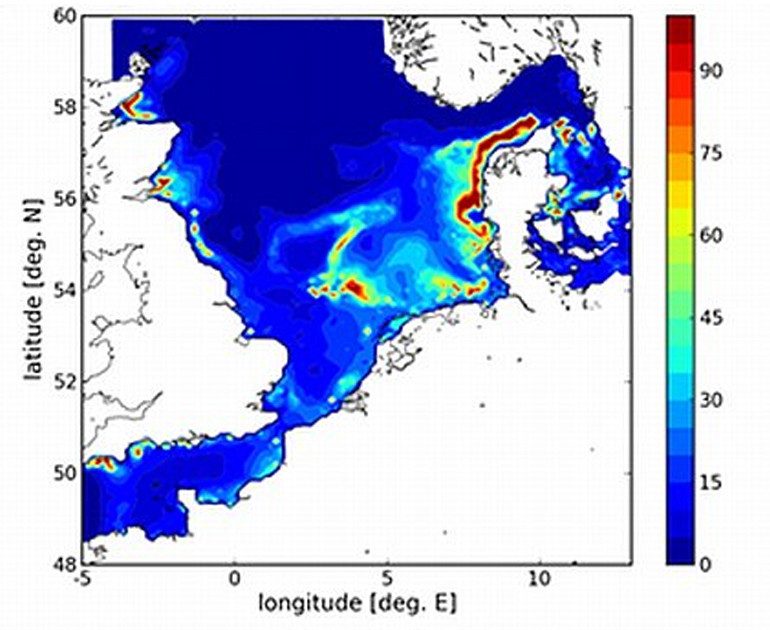 The distribution of particulate N in the sediment as it is now in the model, is mainly controlled by the suspension feeders. The reason is that in the absence of a particulate matter transport model, we can model only net sedimentation. The suspension feeders filter detritus particles and phytoplankton cells out of the water column and put a part (20%) of the excretion products into the sediment. According to the model large sedimentation takes place in this way near the Northern point of Jutland (Denmark), but also in the Oyster grounds and in the German Bight. A number of these areas (e.g. Oyster grounds) are known temporary sedimentation areas. In reality these areas are ‘cleaned’ sometimes during a heavy storm when all small detritus particles are resuspended. These fine detrital particles are transported to the Skagerrak and settle there.