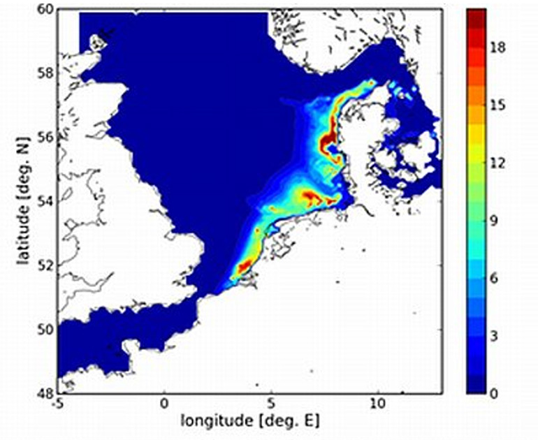The tracked N, originating from the river Meuse and Rhine are sedimentated along the continental coast, and much less in offshore areas such as the Oyster grounds (80 km North of the Netherlands) .