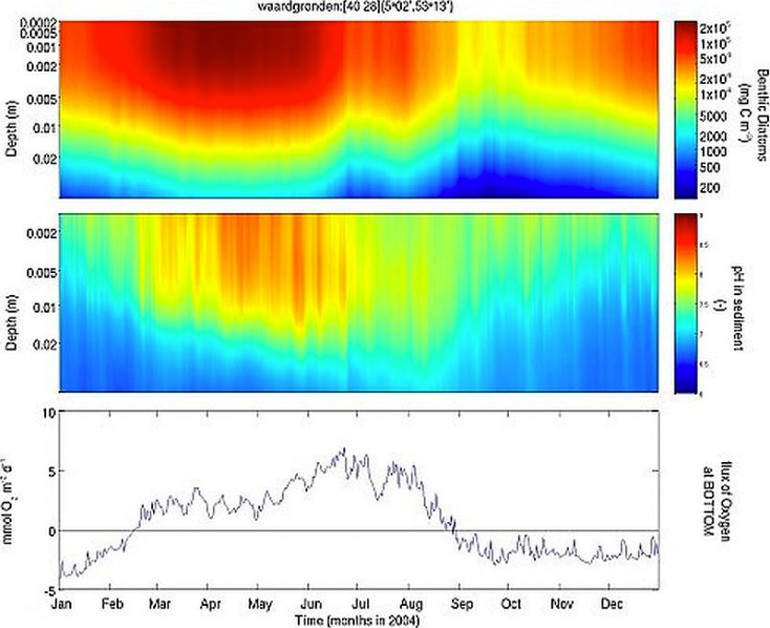 The Waardgronden are used to illustrate the dynamics of benthic diatoms in an area of highlying tidal flats with a short period of submersion. The vertical distribution of benthic diatom biomass in the sediment clearly shows that both the biomass and the production is maximal in spring . The large uptake of CO2 from the pore water in the sediment for the primary production leads to an increase in pH and also to a net flux of oxygen from the sediment. From September to March the oxygen consumption by mineralization of organic material is higher than the oxygen production by benthic diatoms and in that period there is a net flux of oxygen into the sediment.