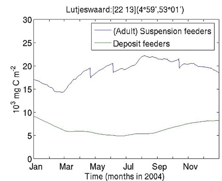 The differences between the seasonal biomass development of filter-feeders and deposit feeders in the Lutjeswaard and the Waardgronden are significant: the growth of the deposit-feeders takes place in spring on the Waardgronden but on the Lutjeswaard only in autumn. an area close to a large tidal gully (the Lutjeswaard) the biomasses of both filter-feeders and deposit-feeders are much higher than on the Waardgronden, which lies further away from large tidal channelsHowever the deposit-feeders reach relatively higher concentrations on the Waardgronden than the filterfeeders . This in contrast to the Lutjeswaard.