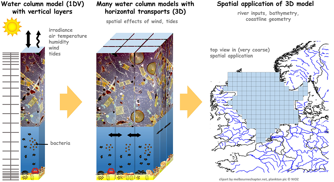 Spatial modelling with an ecosystem model: from general water column processes to a geographically explicit application. Here the hydrodynamic model will provide the vertical and horizontal transport of physical, chemical and biological properties.