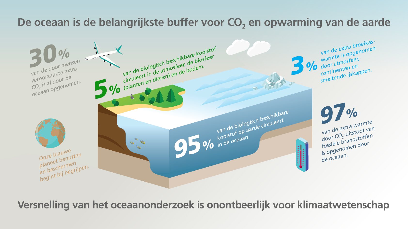 De zee is van fundamenteel belang voor de systemen op aarde die ons klimaat regelen. Maar dit delicate evenwicht loopt steeds meer gevaar door menselijke activiteiten. Alle plannen om het klimaat van de aarde te stabiliseren, hangen ook af van het feit of de oceaan CO2 uit de atmosfeer blijft verwijderen. Maar dit delicate evenwicht loopt steeds meer gevaar door menselijke activiteiten. Daarnaast bieden kustgebieden en zeeën ook oplossingen, bijvoorbeeld op het gebied van CO2-opslag, duurzame energie, alternatieve voedselbronnen en natuurlijke kustbescherming.