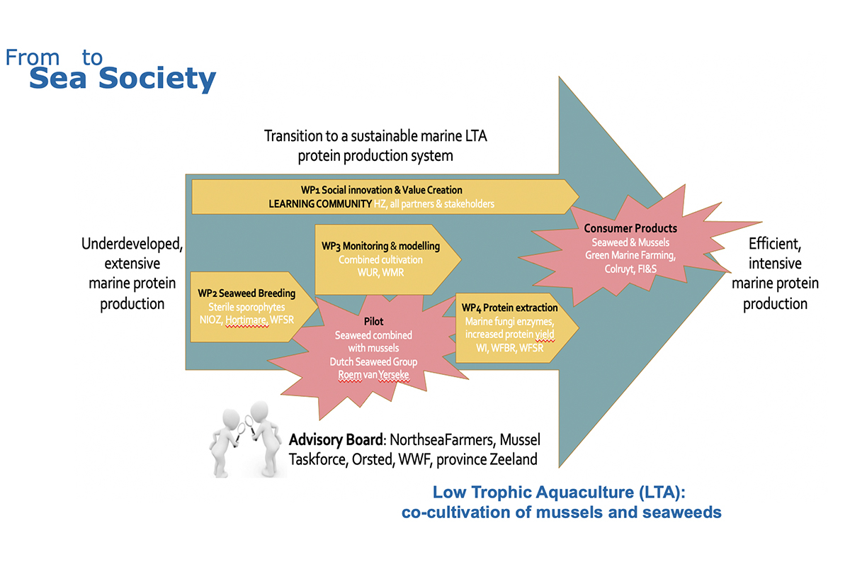 "Er is een dringende behoefte aan een alternatieve productieketen van eiwitten, en daarom wordt hier het initiatief genomen voor een mariene, efficiënte, duurzame, laag trofische aquacultuurketen (LTA), die gebaseerd is op biomassa van gecombineerde off-shore teelt van zeewier en mosselen". zegt Klaas Timmermans. "Sociale innovatie en waardecreatie van deze eiwitproductieketen hebben hierbij topprioriteit. Ze zullen worden ondersteund door doorbraken vanuit de levenswetenschappen, zoals veredeling van steriele zeewieren, innovatieve bio-raffinage en inzicht in de draagkracht van het natuurlijke mariene ecosysteem. De vergaarde kennis en kunde zal worden samengebracht in een FS2S-“learning community”, die ook de continuïteit van de LTA zal waarborgen."