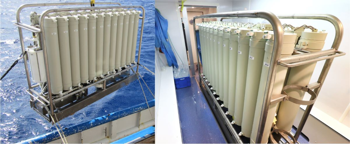 Een foto van het nioz Titan ultra-schone monstername systeem terwijl het net uit zee komt aan boord van onderzoekschip Pelagia (links) en in de speciale lab-container (rechts). Het systeem is geheel gemaakt van plastic en titanium om verontreinig te voorkomen. Monsters uit dit systeem worden alleen in speciale laboratoria, zogenaamde ‘Clean rooms’, opgewerkt en gemeten en de lab-container is een voorbeeld van zo’n clean room. Foto’s gemaakt door Loes Gerringa, NIOZ