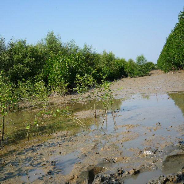 Mangroves are tropical forests that grow on the boundary between land and sea. They can withstand frequent tidal flooding with the help of aerial roots. These dense forests full of aerial roots slow down waves and waterflow and can thus increase the flood resilience of low-lying coastal areas.