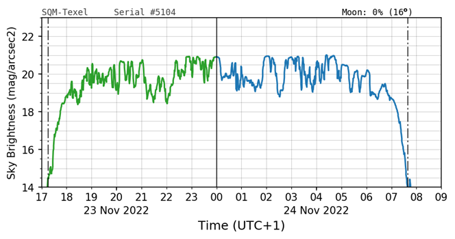 Darkness on the night of November 23-24, 2022 on Texel, measured at NIOZ. At a value of 17 you can see about 200 stars in the sky. When the value is 22, there are about 10,000 stars visible; this is a rarity in the Netherlands. Source: washetdonker.nl
