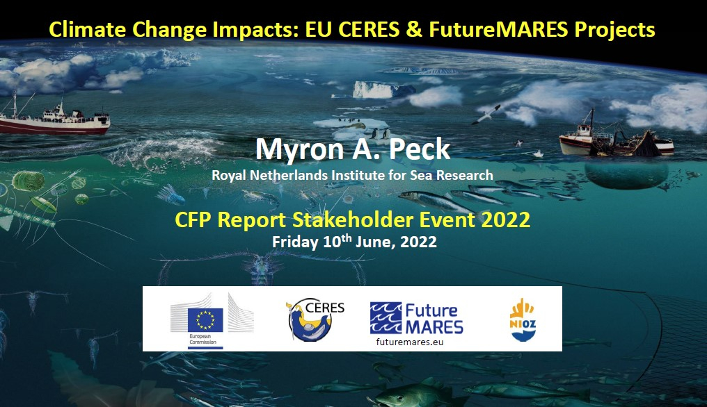 Peck reviewed the direct and indirect effects of projected warming and other changes in ocean habitats on the productivity and distribution of fish stocks and the potential economic consequences. The presentation summarized previous (EU CERES) and ongoing (EU FutureMARES) research providing science-based policy advice for climate-ready seafood harvesting and nature-based solutions. He discussed specific examples of “climate winners and losers” throughout most European regional seas. He highlighted knowledge gaps, such as predicting food web responses and underscored the need for continued ecological monitoring and for local-scale social and economic impact studies.