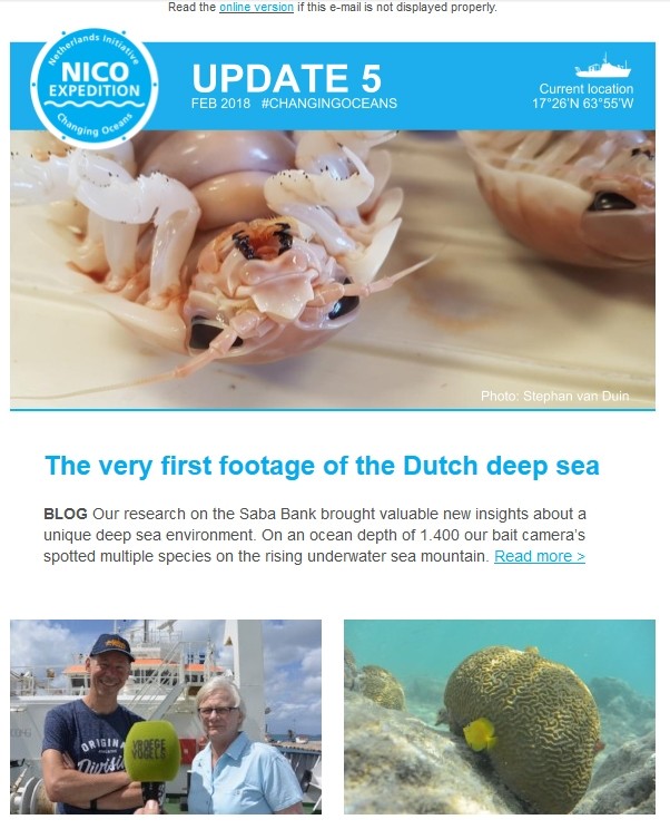 De rijzende zeeberg bij Saba is een interessant onderzoeksgebied voor ecologen van de NICO-expeditie die in het teken staat van de 'veranderende oceanen'. Met deze eerste beelden wordt een basis gelegd om veranderingen in dit stuk Nederlandse diepzee te kunnen bestuderen. De Sababank rijst honderden meters hoog en is bekend om zijn koraalriffen op de ondiepe top. Deze hebben een belangrijke functie als schuilplaats, kraamkamer en leefomgeving voor vis en kreeftachtigen, maar wat er precies leeft op de diepere flanken van dit unieke stukje diepzee dat Nederland rijk is, was nog nooit eerder gezien.