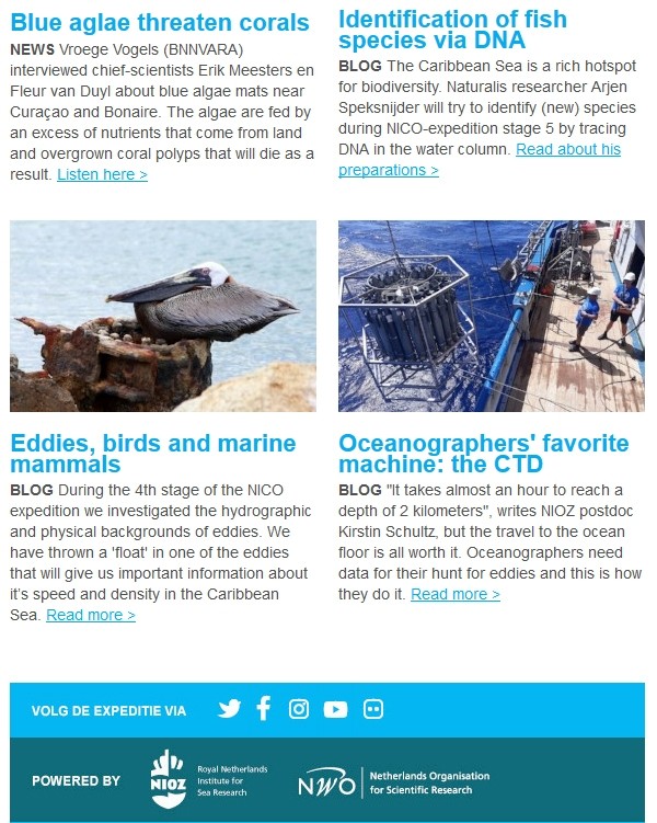 De NICO-expeditie (Netherlands Initiative Changing Oceans) is een wetenschappelijke vaartocht waaraan 100 onderzoekers van 20 organisaties deelnemen. Uniek aan de expeditie is het multidisciplinaire karakter. De 7 maanden durende expeditie vaart vanuit de Caribische Zee, via de Mississippi delta en Ierland terug naar Texel in Nederland en duurt nog tot eind juli 2018. Tijdens de tocht varen geologen, zeebiologen, ecologen en oceanografen mee die onder meer onderzoeksvragen hebben opgepakt uit de Oceanennotitie die de Rijksministerraad vorig jaar heeft goedgekeurd.