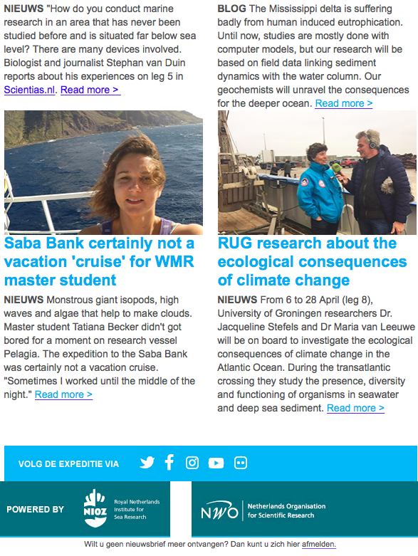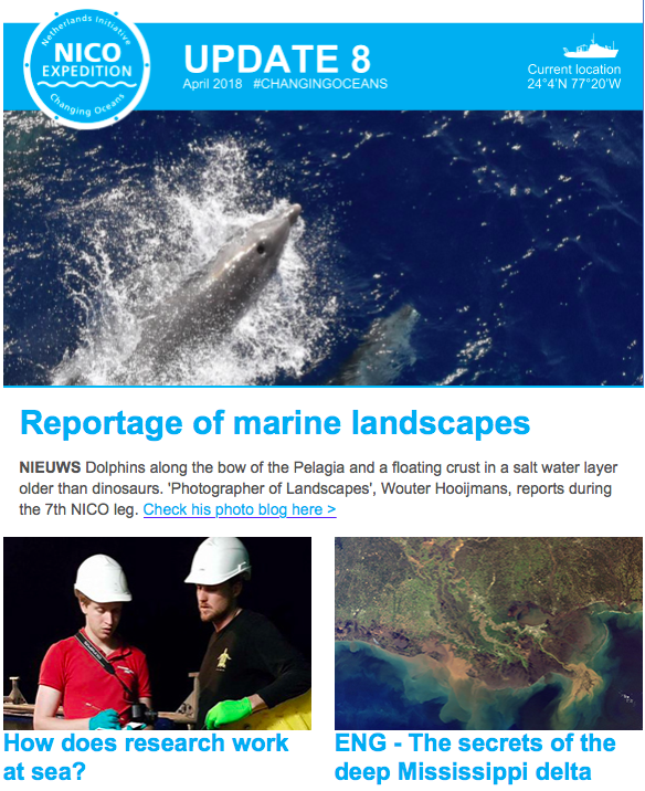 The NICO expedition (Netherlands Initiative Changing Oceans) is a scientific cruise initiated by the Netherlands Organisation for Scientific Research (NWO) and Royal NIOZ to investigate changing oceans. Over 100 researchers from 20 organizations are participating in the expedition which aims to examine the characteristics of the ocean and the seas. The multidisciplinary character is unique to the expedition. The 7-month expedition sails from the Caribbean Sea, via the Mississippi delta and Ireland back to Texel in the Netherlands and lasts until the end of July 2018. During the trip, geologists, marine biologists, ecologists and oceanographers sail along who have picked up research questions from the Ocean note approved by the Council of Ministers last year.