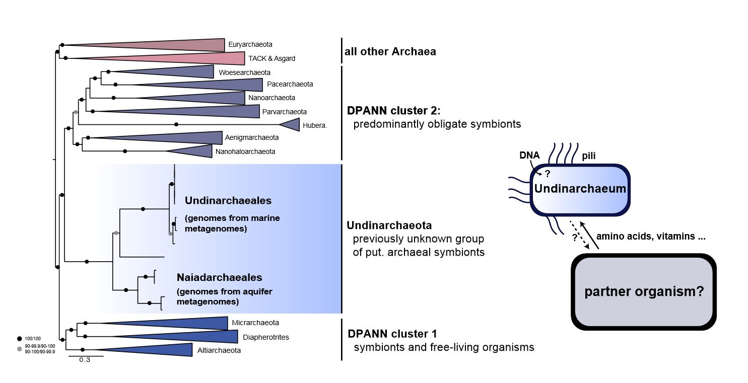 The newly described Undinarchaeota were discovered in genetic material from marine (Indian, Mediterranean and Atlantic ocean) and aquifer (Rifle aquiver, Colorado River) environments. The authors could show that they belong to a very diverse and until recently unknown group of so-called DPANN archaea. Members of the DPANN include organisms with very small genomes and limited metabolic capabilities, which suggests that these organisms depend on other microbes for growth and survival1,2,3. In fact, the few so far cultivated DPANN archaea are obligate symbionts or parasites that cannot live on their own4.