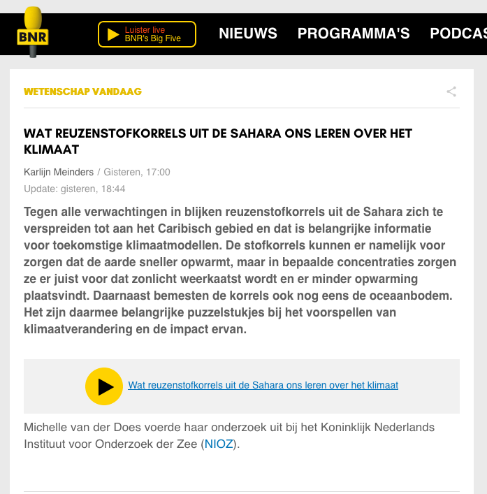 Het promotieonderzoek van Michèlle van der Does is gefinancierd door NWO, en werd uitgevoerd in de onderzoeksgroep van Dr. Jan-Berend Stuut, senior onderzoeker van het NIOZ, in samenwerking met verwant promotie- en post-doctoraal onderzoek gefinancierd door het ERC (European Research Council). Van der Does werkte voor de publicatie in Science Advances over de reuzenstofdeeltjes samen met onderzoekers uit Karlsruhe (KIT; Karlsruhe Institute for Technology) in Duitsland, en Reading (University of Reading) in het Verenigd Koninkrijk.