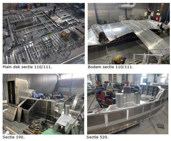 Status at the end of September. The sections from which the hull of the RV Wim Wolff is being built, with in orange sections that are ready and are or have been put together; in dark green loose sections that are ready; in light green the sections being worked on ©FH