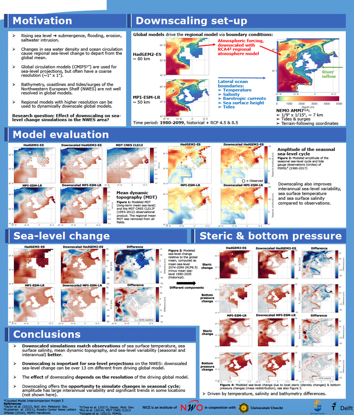 Compared to global climate model simulations, the downscaled simulations of SLC on the NWES show enhanced regional detail and have a higher correlation with satellite altimetry in terms of mean dynamic topography and sea-level variability. Projected changes in sea level over the coming century differ especially near important features in model bathymetry and coastlines, and near strong currents. Along the coast, differences in long-term change of over 13 cm are found. With the results of our study, we can begin to quantify the uncertainties in projections of SLC due to the relatively coarse resolution of global climate models. Our new projections improve the fidelity of SLC projections for European coastal regions and provide more realistic information on variability to SLC projections.