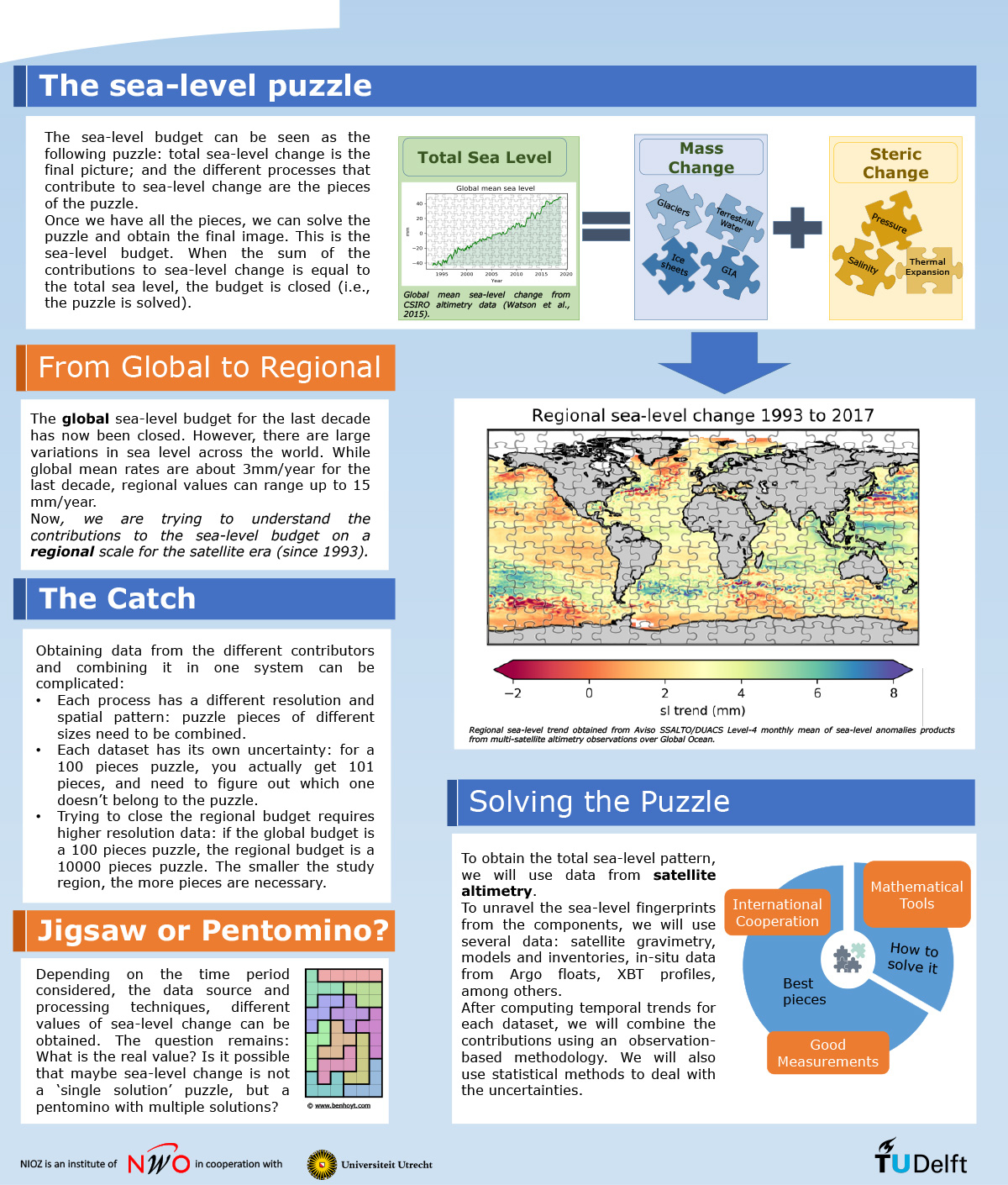 We can look at sea-level change as a puzzle: the total sea-level change, obtained from tide gauges and satellites, represents the final picture we want to put together. The different processes that contribute to sea-level change are the pieces of the puzzle, such as glaciers losing mass and thermal expansion of the oceans. Depending on how each process affects sea level, they can be classified as mass change or steric change. Once we have all the pieces, we can solve the puzzle and obtain the final image. This is the sea-level budget. When the sum of the contributions to sea-level change is equal to the total sea-level, the budget is closed (i.e., the puzzle is solved). Recent studies were able to close the global mean sea-level budget for the last decade. However, there are large variations in sea-level across the world. While global mean rates were about 3mm/year for the last decade, regional values can range up to 15 mm/year. Although global values are good indicators of the global climate change, regional values are necessary for mitigation and adaptation plans to sea-level rise. Our project aims on closing the regional sea-level budget in the satellite era (since 1993).