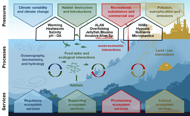 Seafood resources, iconic and culturally valuable marine habitats, and the functioning and regulation of global cycles are currently under threat from a multitude of human-made and natural stressors. Robust, science‐based advice is urgently needed to implement actions to halt biodiversity loss and restore natural habitats and ecosystem services.