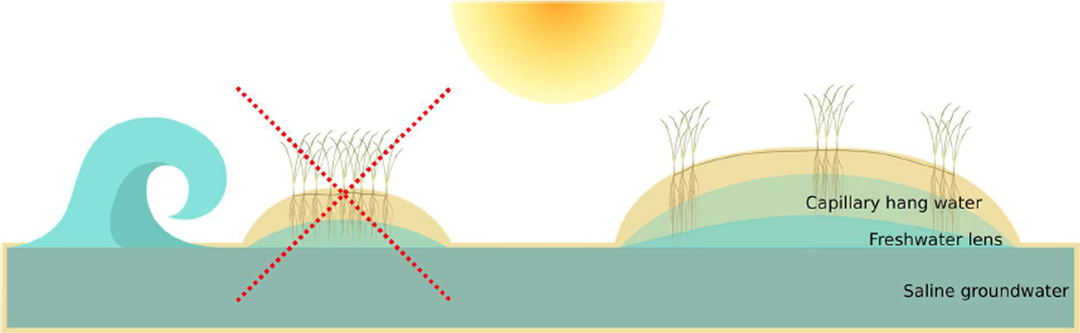 Indeed, other recent work revealed that, rather than forming single large vegetation patches, dune grasses adopt a clonal expansion strategy that generates multiple smaller patches instead of one big clump6. Such strategy optimizes sand trapping and thus maximizes dune formation rate. The faster buildup of a higher dune would allow grasses to escape erosion from flooding. Furthermore, grasses in such larger dunes may better cope with freshwater limitation (from both seawater flooding and drought) by having access to rainwater stored as capillary hang water and developing freshwater lenses above the saline groundwater7 (see graphical abstract). Pilot experiments with dune grasses also suggest that a dune-size threshold may be surpassed to trigger these establishing dynamics (unpublished data). In drylands, vegetation self-organizes to form spatial patterns that optimize water storage through increased water infiltration in patches and allow plants to survive drought2,3. Inspired by the parallels with drylands, our new team will join expertise from coastal and dryland ecosystems to explore if dune grasses also organize themselves in spatial patterns that optimize the buildup of freshwater-storing dunes to survive flooding and drought .