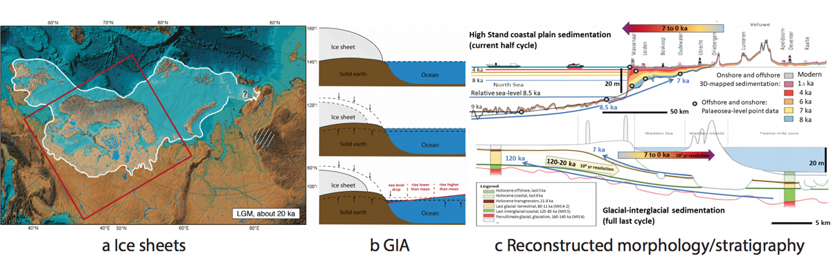 Sea-level rise (SLR) is one of the most important consequences of global warming and carries significant repercussions on coastal human settlements and natural ecosystems1,2. Global SLR research aims at solving the so-called 'sea-level budget' over the last few glacial-interglacial cycles.3 Global-scale research efforts then provide the forcing and boundary conditions for regional-scale GIA modelling (Fig. 1ab), such as for the North Sea area4. At that scale, sediment isostasy an compaction (SIC) becomes an important additional factor that has to be implemented in the modelling5, through data intake and adapted algorithms – the topic of this proposal. Regional sedimentation (Fig. 1c) varied greatly in rates and amounts and locations between glacial and interglacial times, partly controlled by SLR and GIA movements but also independently6. By inserting sedimentation from mapping knowledge (data assimilation) in otherwise deterministic geophysical models, we will reveal the magnitude of local SIC vs. regional GIA patterns which we reckon to be significant for our understanding of centennialmillennial coastal plain development and habitat evolution, and for evaluating anthropogenic vs. natural sedimentation5.