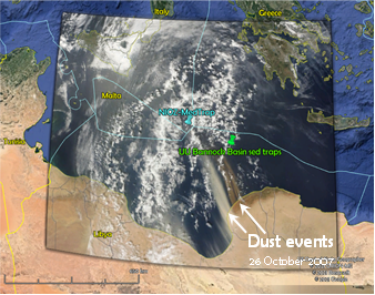Google Earth map of the central Mediterranean Sea showing the locations of the sediment trap sites that will be used in this project. The overlay of a satellite image (©NASA) shows a two-colour dust outbreak from Libya on 26 October 2007.